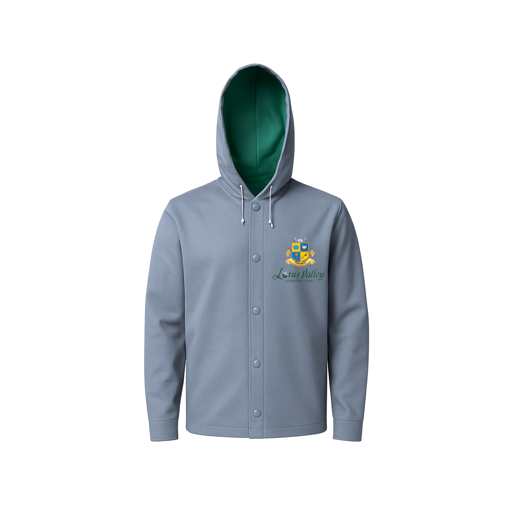 The Lotus Valley International School Winter Jacket is a premium hooded outerwear designed to protect students during cold and windy days. Made from durable, warm fabric with a soft inner lining, it provides excellent insulation and comfort. Featuring a detachable / adjustable hood, full front closure with buttons, and secure sleeve straps, this jacket ensures maximum warmth and protection. The embroidered school crest on the front and “Lotus Valley” branding on the back highlight school pride, while the smart grey color with green detailing complements the uniform perfectly. A must-have winter essential combining style, durability, and functionality.