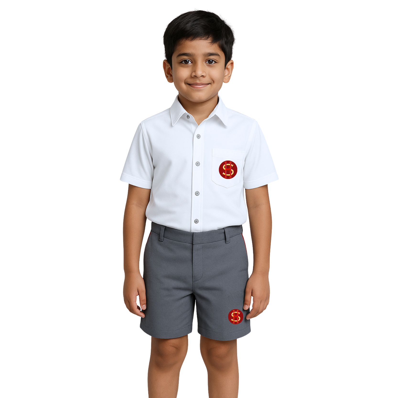 Classic white half-sleeve school shirt with button-down design and chest pocket embroidered with logo.