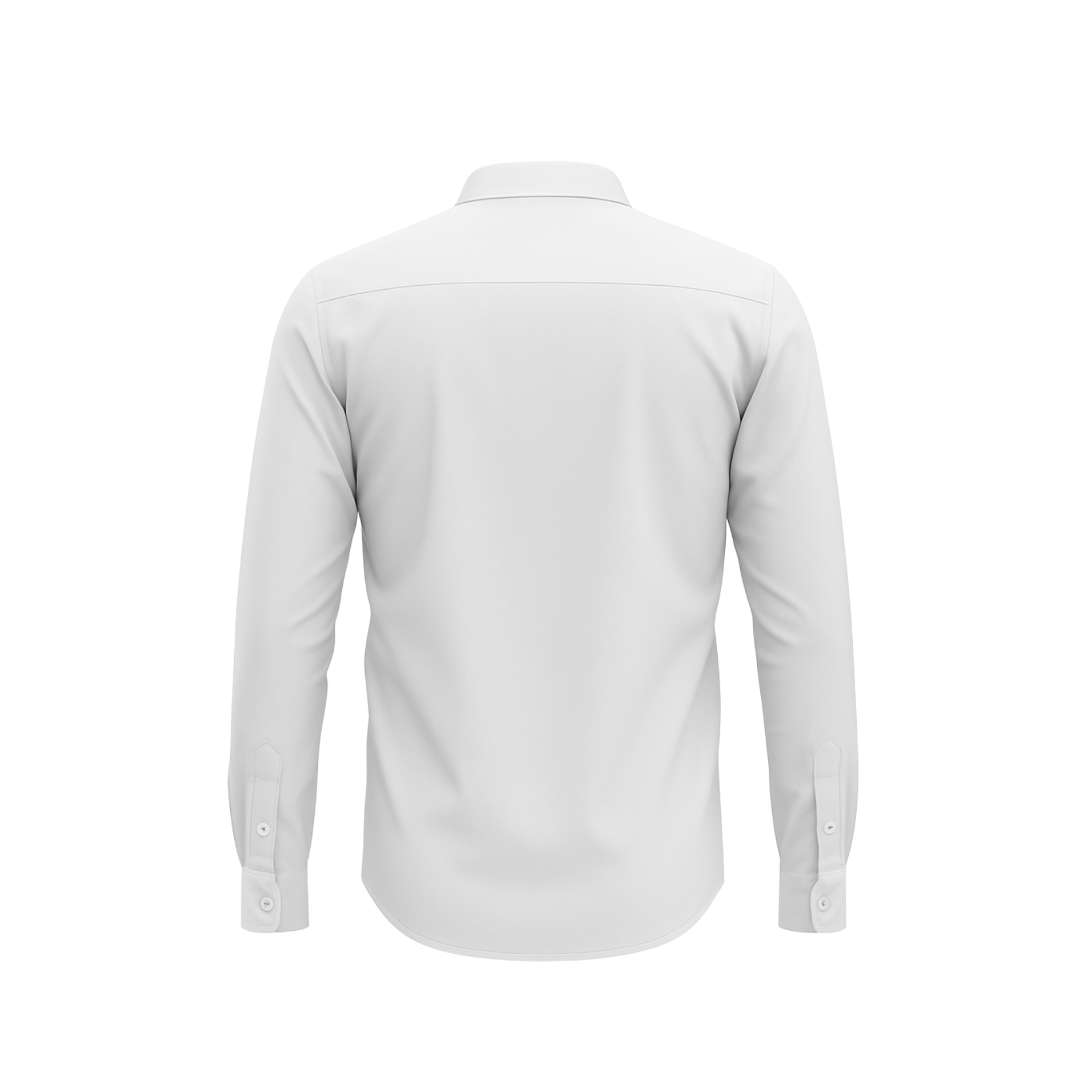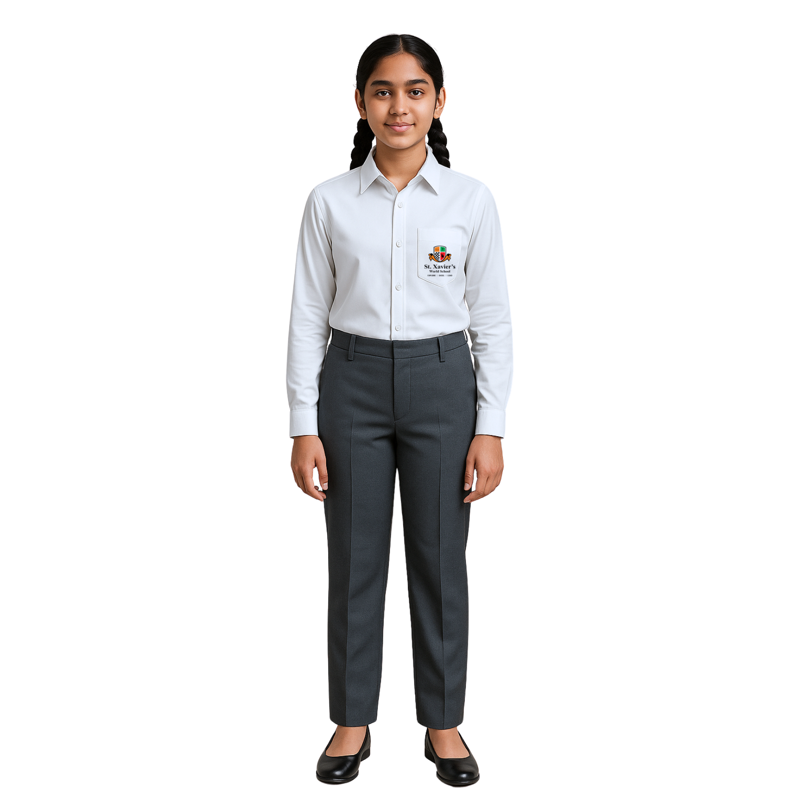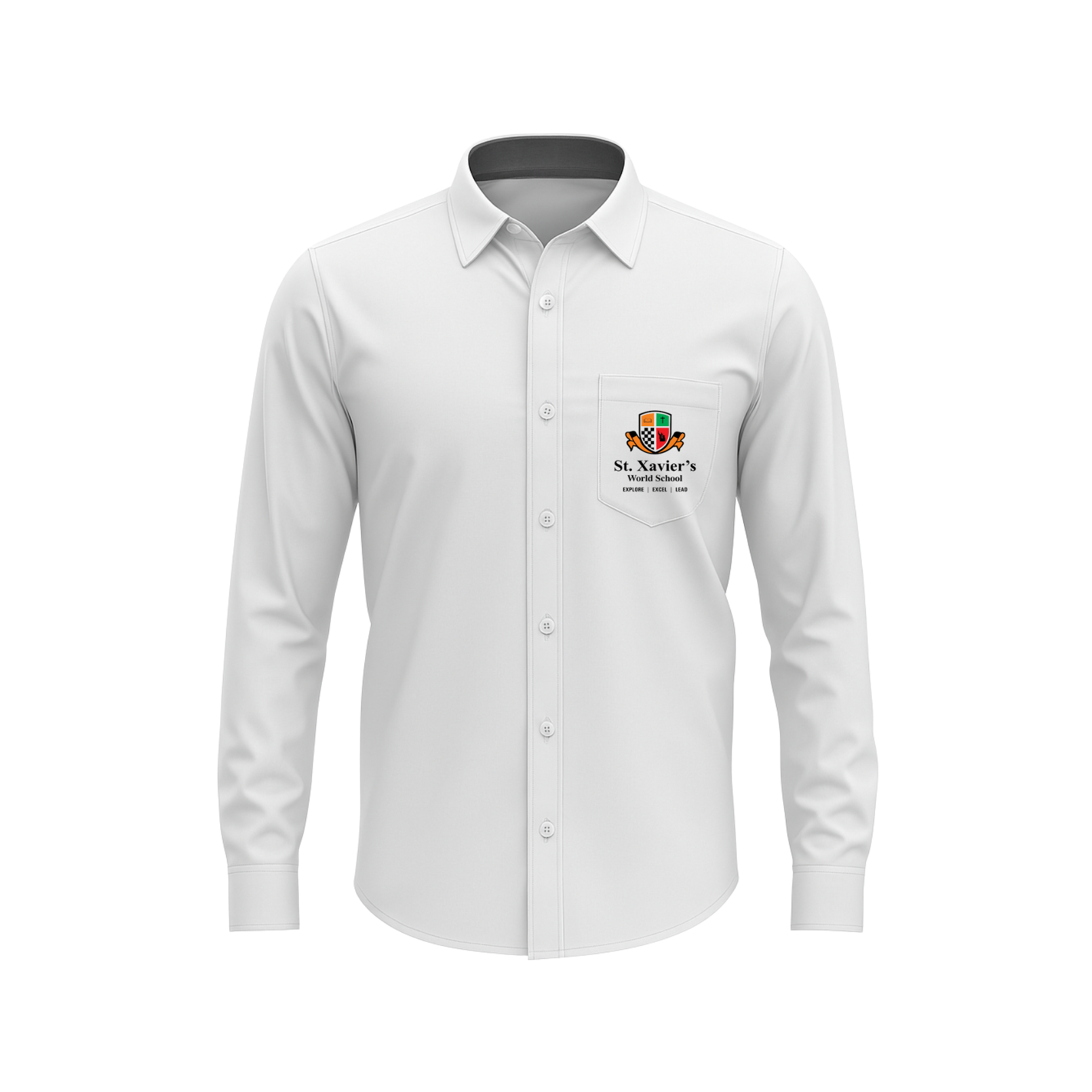 A crisp white, full-sleeve shirt made from breathable cotton-blend fabric, featuring a regular collar and front button closure. Worn as part of the daily school uniform, it reflects neatness and uniformity among St. Xavier's students.