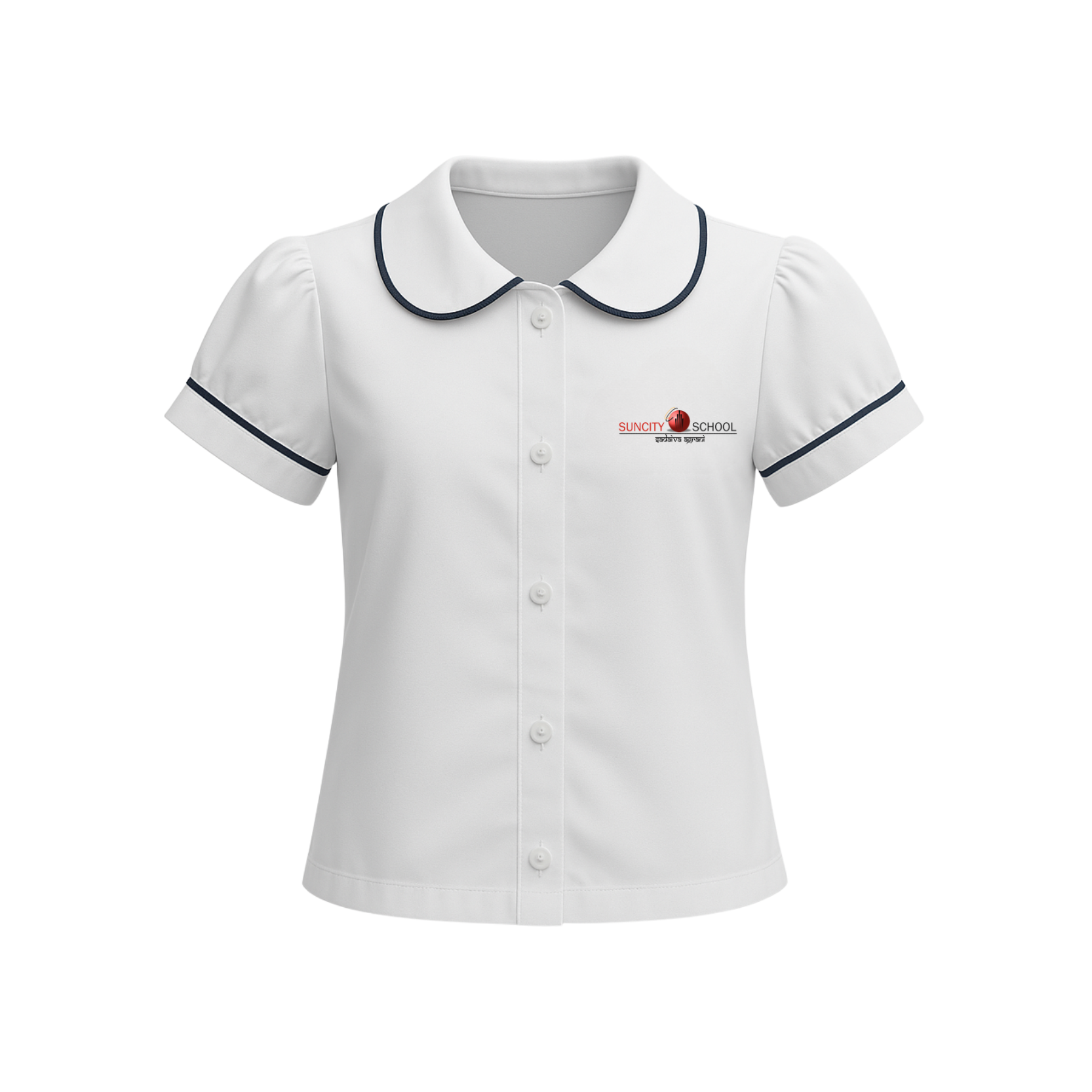 White half-sleeve shirt with puffed sleeves and contrast piping, tailored for junior girls.